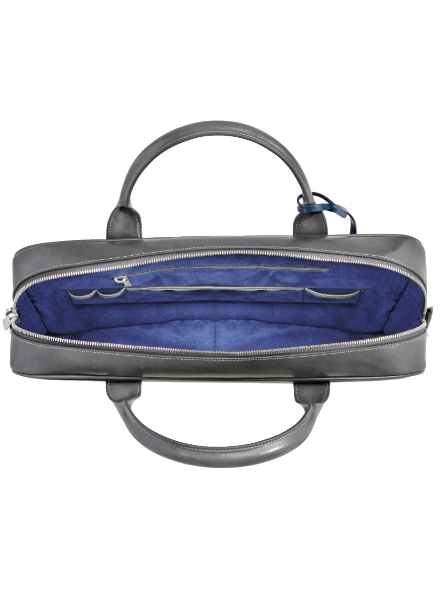 You will not go unnoticed by the new Line D collection in two-tone leather by S.T. Dupont. This elegant navy blue and palladium-finish calf leather briefcase features pockets and compartments for easy storage. Sold online and in person at the Art Brown International Pen Shop.