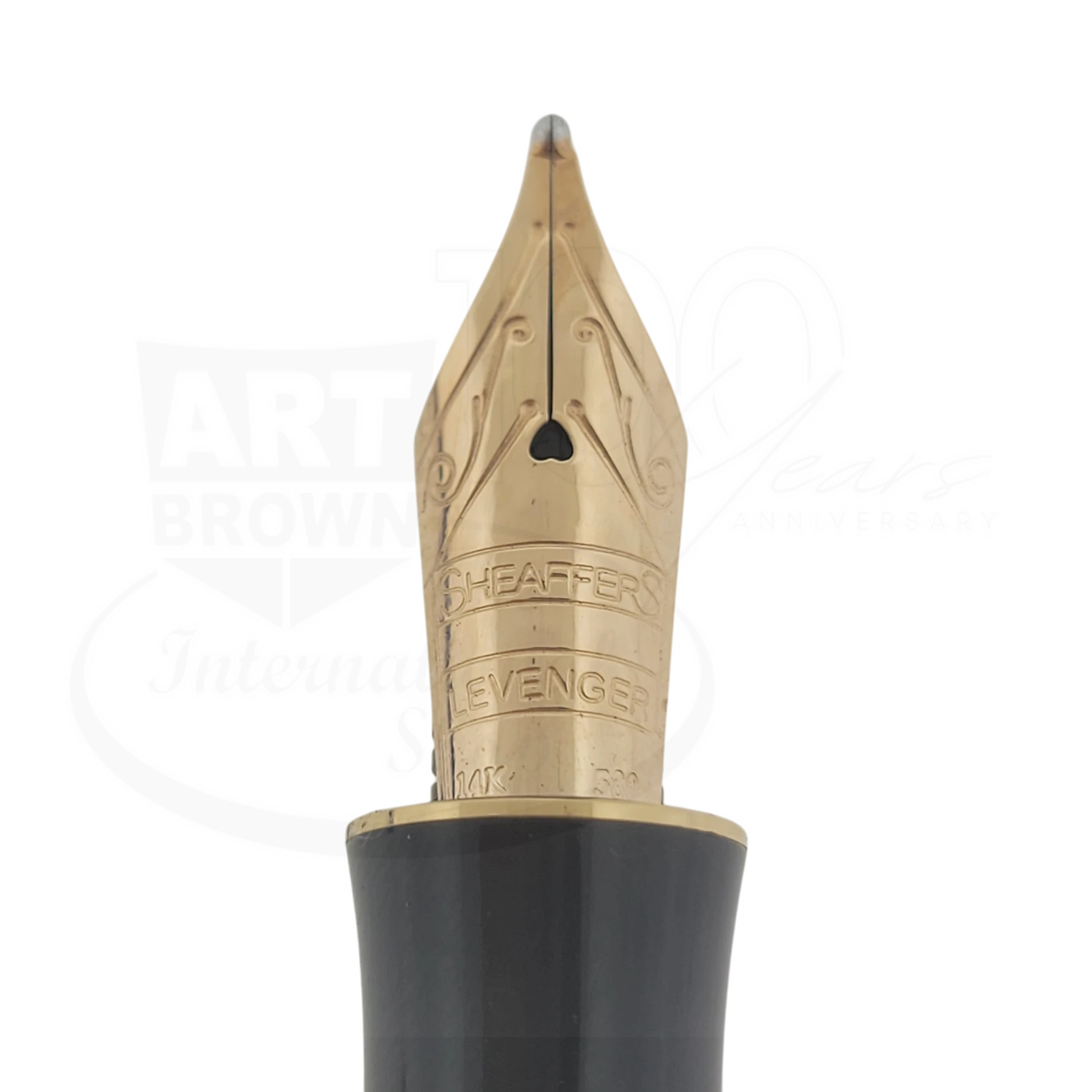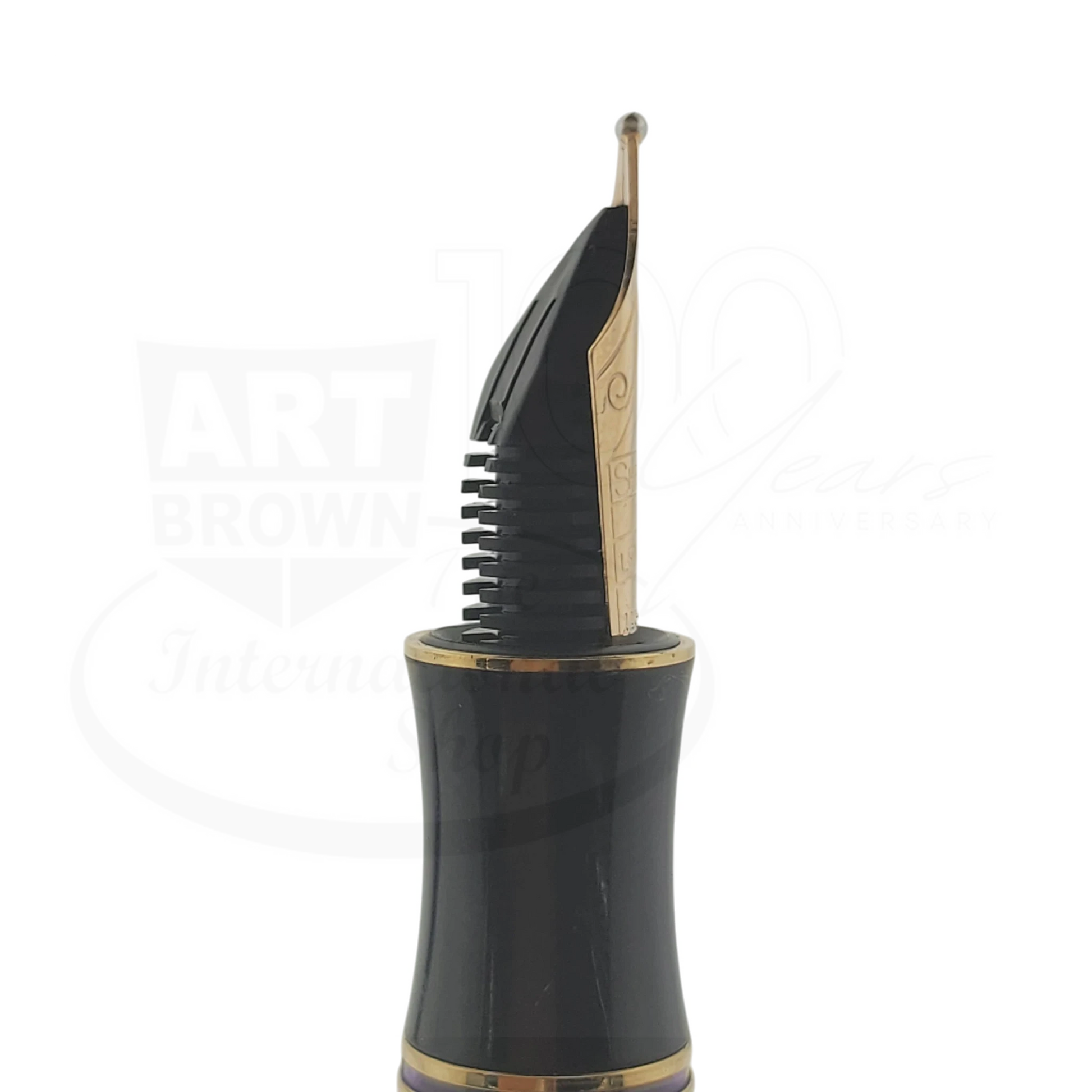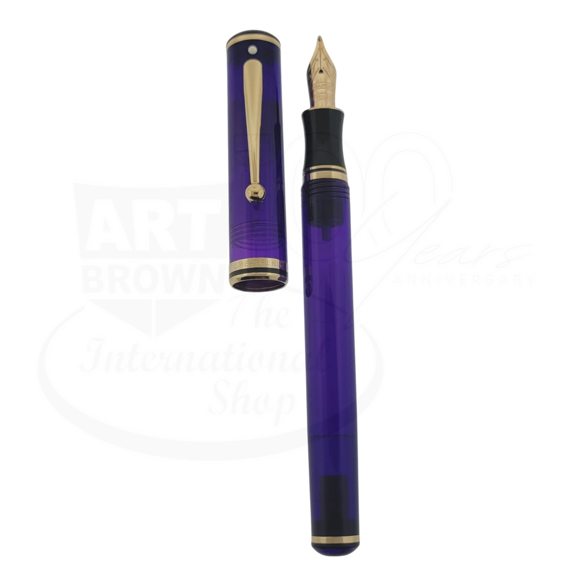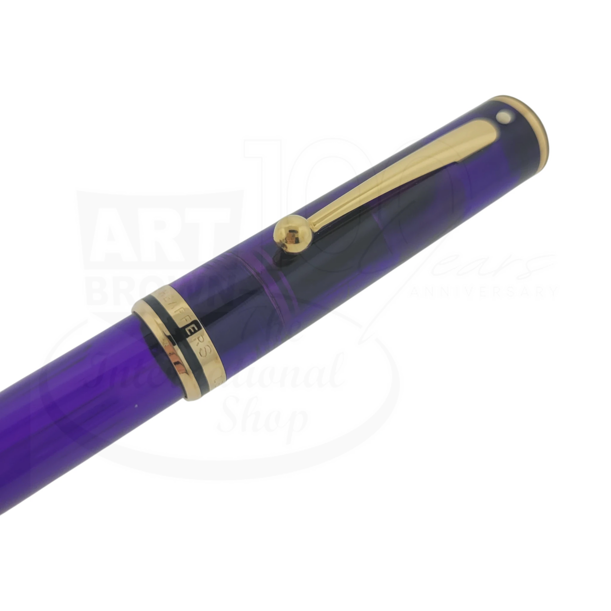 The Sheaffer Levenger Purple Demonstrator Fountain Pen blends vibrant design with refined writing performance. Its translucent purple resin body reveals the inner workings of the pen, offering both beauty and functionality. The pen is fitted with a 14K gold medium point nib, engraved with classic Sheaffer detailing, ensuring smooth ink flow and a balanced writing experience. Finished with gold-plated accents and a sturdy clip, this pen is both a collector’s piece and a daily writing essential.