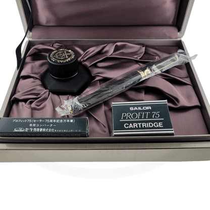 Sailor Profit 75th Anniversary Fountain Pen. 1986 Limited Edition Pen. The Cap features a jeweled Emblem with Sailor and Anchor, 75 in a circle. The Cap is stamped 75 years of History. The Body is Carbon Fiber. The Nib is two toned, Black Coated Gold on outside and Yellow Gold on the inside.