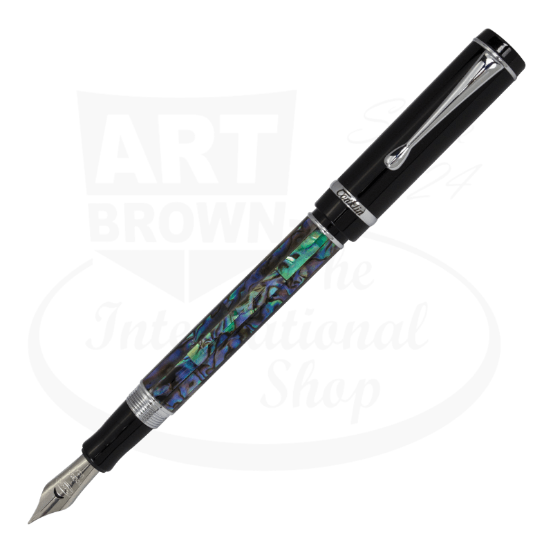 Reach paragon levels in your writing and emit excellence from your mind. Revealing abstract potential and lighting the way will be Abalone Nights. Conklin Duragraph® adds the Abalone Nights to your must-have collection of unique collectibles; sharing the dynamics of an abalone shell, this zestful pen hones an iridescent finish with an array of metallic hues. Featuring black noir resins on the cap and front section, it is also paired with chrome metal plating on the threads and clip. Fitted between the black resin cap and the chrome thread is our very special abalone glossy shell. Like the shell, the Abalone Nights is extremely durable and its dynamically crafted luminous finish resembles peacock green, cobalt blues, and metallic purples giving it a mystical high status. The Abalone Shell has been used as rare decorative jewelry for centuries in ancient cultures and ritual ceremonies. It is an important and vital staple in native cultures around the world. Take note of this collectible’s barrel, seeing how it absorbs the tranquility features of the abalone shell; admiring it in the light when hand-turned, it reflects the shimmering essences off of its surface, enhancing the stunning colors like radiating energy. With its perfect development, the cap easily twists off and flawlessly snugs on the back end of the barrel. This rare finish pen is available in fountain pen, rollerball, or ballpoint. The fountain pen’s nib is available in Jowo premium Extra Fine, Fine, Medium, Broad, Stub and Omniflex size, and uses an included threaded piston ink converter or ink cartridges. Ballpoint accepts Parker™- style ballpoint refills, and the capped rollerball accepts standard international rollerball refills. Sail the seas with your new oceanic pen and manifest greatness!