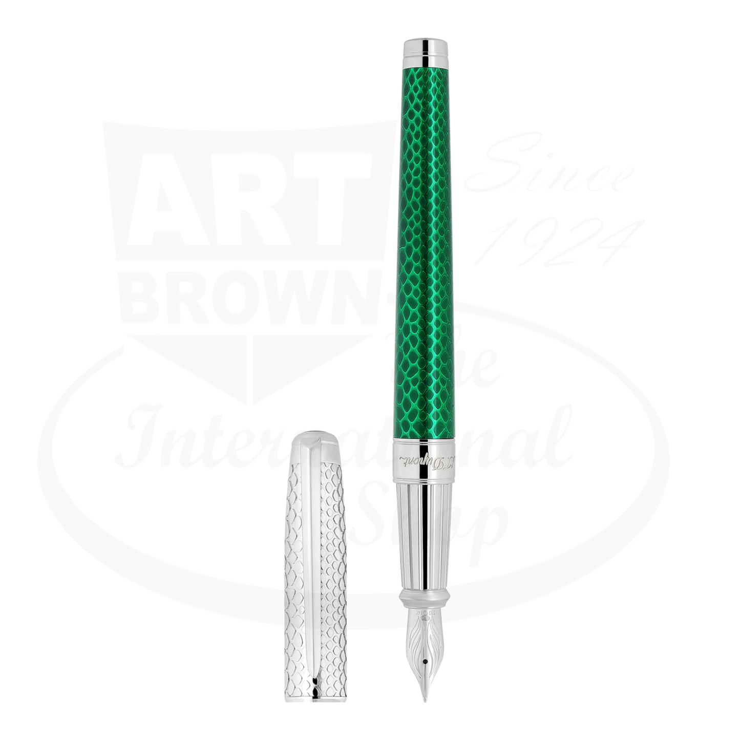 The S.T. Dupont Line D Eternity Fountain Pen in green snake-scale guilloché lacquer is a masterful tribute to the Year of the Snake, blending heritage craftsmanship with refined luxury. The palladium-finished cap features an intricate snake-scale guilloché pattern, while the lacquered barrel enhances its depth and brilliance. This fountain pen is equipped with a rhodium-plated 14K gold nib, ensuring a smooth and precise writing experience. The articulated Sword clip adds a signature S.T. Dupont touch, making this a coveted piece for collectors and enthusiasts of fine writing instruments.