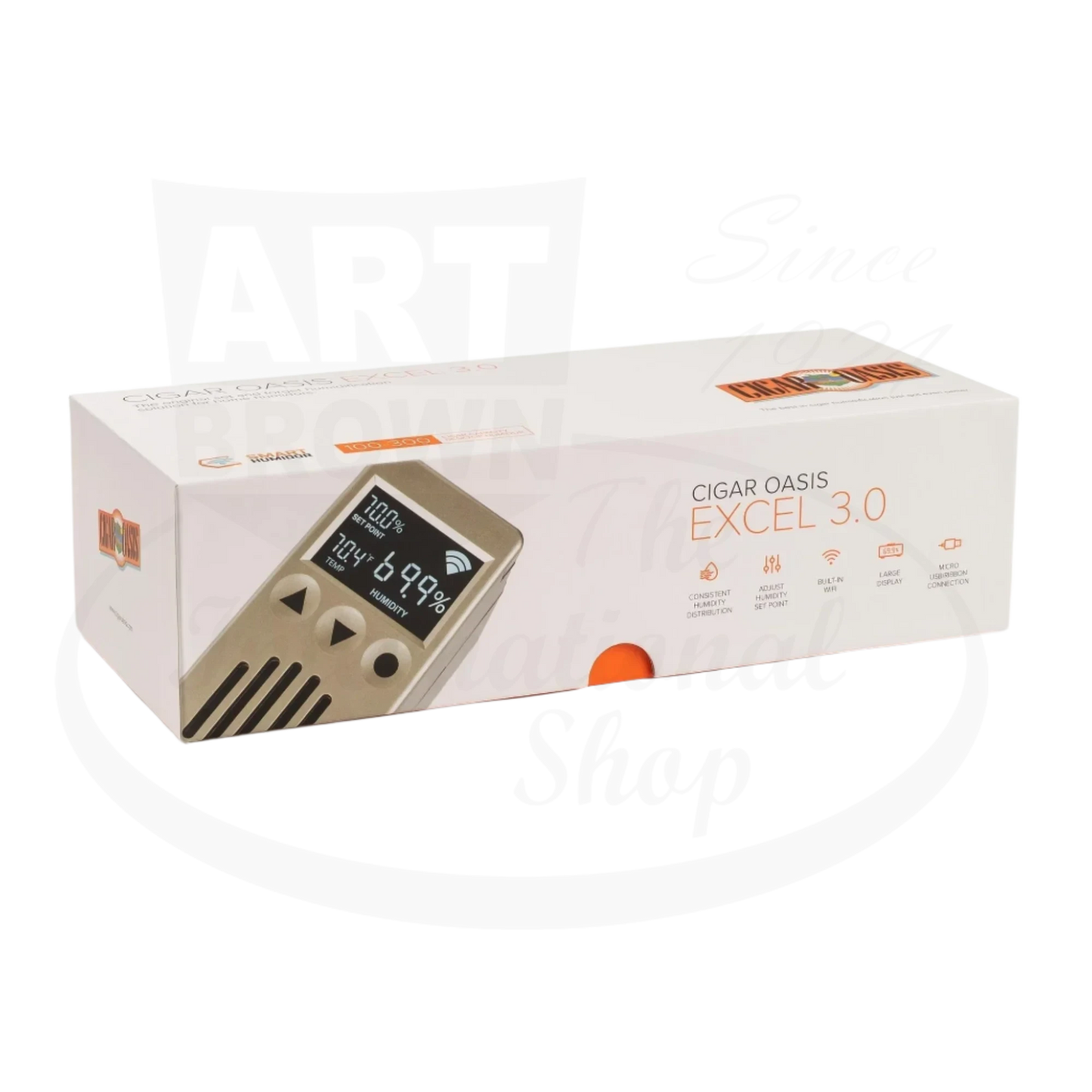 The Cigar Oasis Excel 3.0 Humidifier is expertly designed for desktop and small cabinet humidors, capable of maintaining perfect humidity levels for collections of around 100-300 cigars. Its long-lasting, pre-treated water cartridge only requires distilled water every 2-4 months, ensuring low-maintenance care for your cigars. Powered by a sleek electronic ribbon cable that fits seamlessly through the humidor’s seal, the Excel 3.0 offers reliable functionality without compromising your humidor's integrity. A large, backlit display provides real-time humidity and temperature readings, with easy-to-use soft-touch sensor buttons for precise adjustments. For added convenience, the built-in Wi-Fi feature allows optional connection with the Cigar Oasis SmartHumidor™ app, making it easy to monitor and adjust conditions from your smartphone.