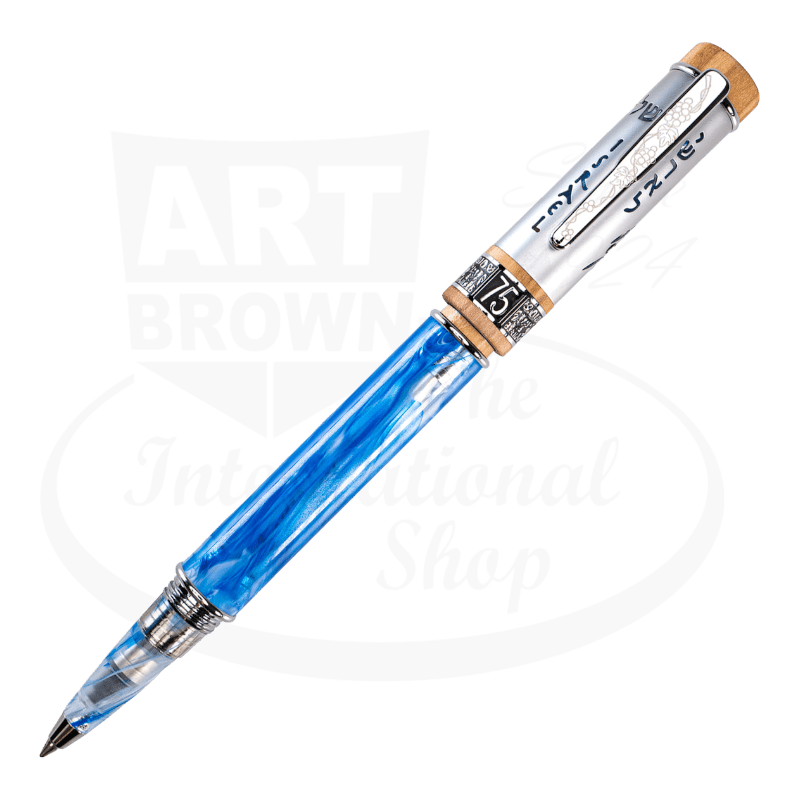 Israel is a sacred land that represents spiritual and religious identity. It is not just a country but a symbol of important cultural values of national and universal significance to its people 75 years ago on the 14th of May 1948, Israel declared independence and regained its natural birth right; a sovereign Jewish state, by which those who live within its borders can be liberated from persecution, be free to express their culture openly, and to practice their religion fully without hindrance or fear. Many have aspired, and fought to have a land in which to call their own again, to return to Zion and the Land of Israel. There are scores of people to thank for their aide in the establishment of Israel, but none quite like Theodore Herzl. He was a journalist and writer who sought to form a Jewish state in the Land of Israel by spreading his ideas through pamphlets and later a book, gaining international attention and popularizing political Zionism. Through his words, he single handedly unified the Jews and brought to light the injustices inflicted on his people. Though he died long before its establishment, Herzl is considered to be a father of the State of Israel. “Let me repeat once more my opening words: The Jews wish to have a State, and they shall have one. We shall live at last as free men on our own soil, and die peacefully in our own home. The world will be freed by our liberty, enriched by our wealth, magnified by our greatness.” Theodore Herzl (1896), A Jewish State. Conklin® is proud to introduce the Israel 75 Anniversary Diamond Jubilee(a special anniversary celebration) Limited Edition 1948 Collection, a revitalized design of a vintage Conklin classic, a fountain pen, a rollerball and a ballpoint collection. Exceptionable to look at and even better in hand, the Israel 75 is as unique as it is stunning. Machined to perfection and scrupulously hand-polished, the Israel 75 body features one of a kind high-graded blue and white resin, olive wood, and is then adorned with striking chrome accents along the overlay, clip and rings. Made with elaborate attention to details, each writing instrument is a visual representation of the country. Beautiful satin chrome plated overlay out of which a design is carved. The custom-made resin underneath displays the main symbols of Israel’scultural values: words Israel and (Israel in Hebrew); a dove and an olive branch, recognized throughout the world as a token of peace; the seven-branched Menorah, symbolizing the seven days of Creation; the Hebrew word Shalom, meaning "Peace" (one of harmony and contentment, in complete peace); the Torah, representing the core of the Jewish spiritual and religious tradition. Located along the olive wood top of the cap is an intricately engraved coin with the Star of David encircled by the Shema Yisrael (the centerpiece of the daily morning and evening prayer services) that reads Hear O Israel, the Lord is our God, the Lord is One. The clip is etched with a grape vine design on it as a symbol of the Tree of Life. The band of Israel 75 incorporates the sacred Western Wailing Wall (Kotel in Hebrew), long believed to be the sole remains of the Second Temple, that stood in Jerusalem for over 2000 years as well as a numerical reference to the 75th anniversary years: number 75 and in Hebrew numerology. Each pen is a unique piece of art. Conklin Israel 75 Anniversary Diamond Jubilee collection is a numbered Limited Edition of 1948 pieces. The fountain pen fills via cartridge or converter (included) and is equipped with a premium #6 JoWo nib personalized with the Conklin name, the historic “Toledo, USA” mark, and a crescent-shaped breathing hole. The nib is available in stainless steel Extra Fine, Fine, Medium, Broad, Stub, Omniflex and 14KT Solid Gold Fine, Medium and Omniflex points. The rollerball accepts standard international rollerball refill. Ballpoint comes with Parker- style ballpoint refill. Each fountain pen is displayed in a custom-made luxury gift box with a bottle of new exclusive, specially-made Blue Diamond ink. The ink is inspired by the blue color of the country’s flag. Each rollerball and ballpoint come in a blue Conklin gift box. Each pen box is fitted with an explicitly designed sleeve. The sleeve is decorated with cut-outs in the shapes of the pen’s overlay symbols through which blue flag color is visible, creating an intricate pattern on the sleeve.