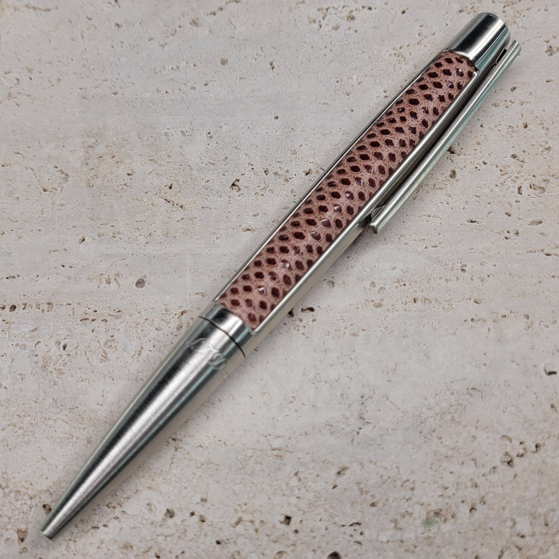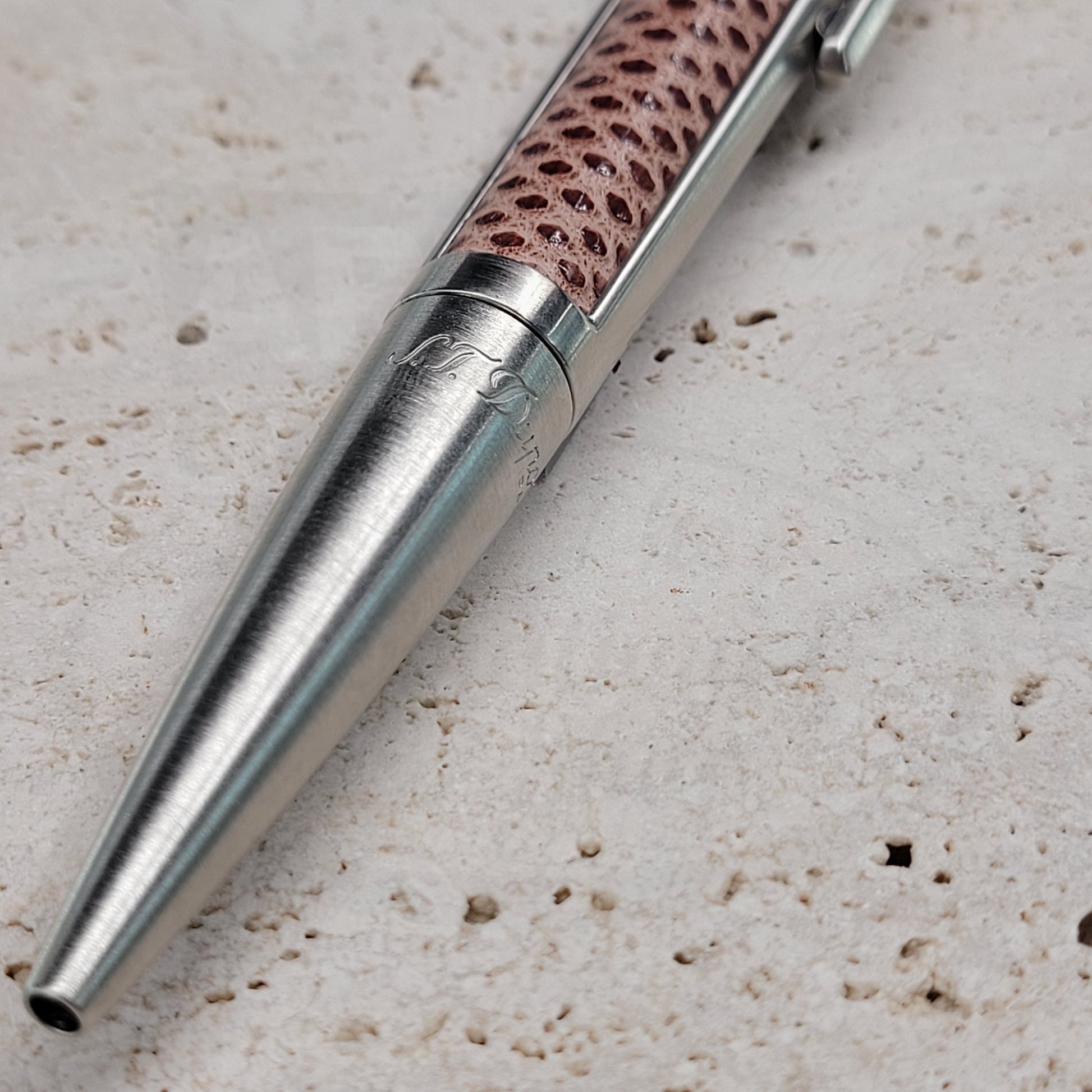 This custom Dupont Defi ballpoint is made with an exotic leather finish around the barrel. Red reptile scale leather will catch your colleague's attention any time, any place. Only one of its kind, get it while you can.