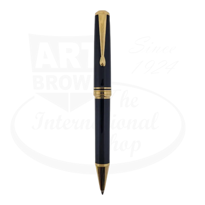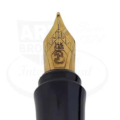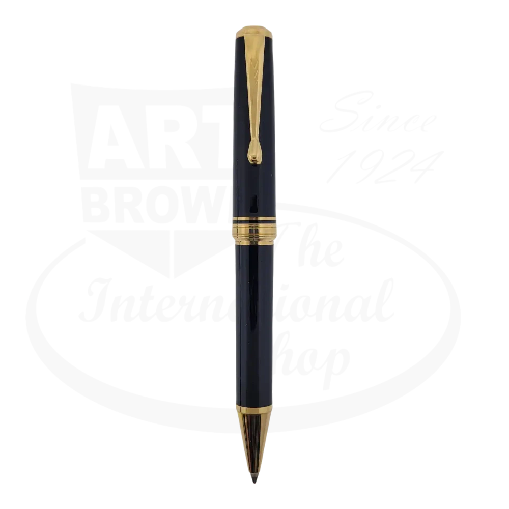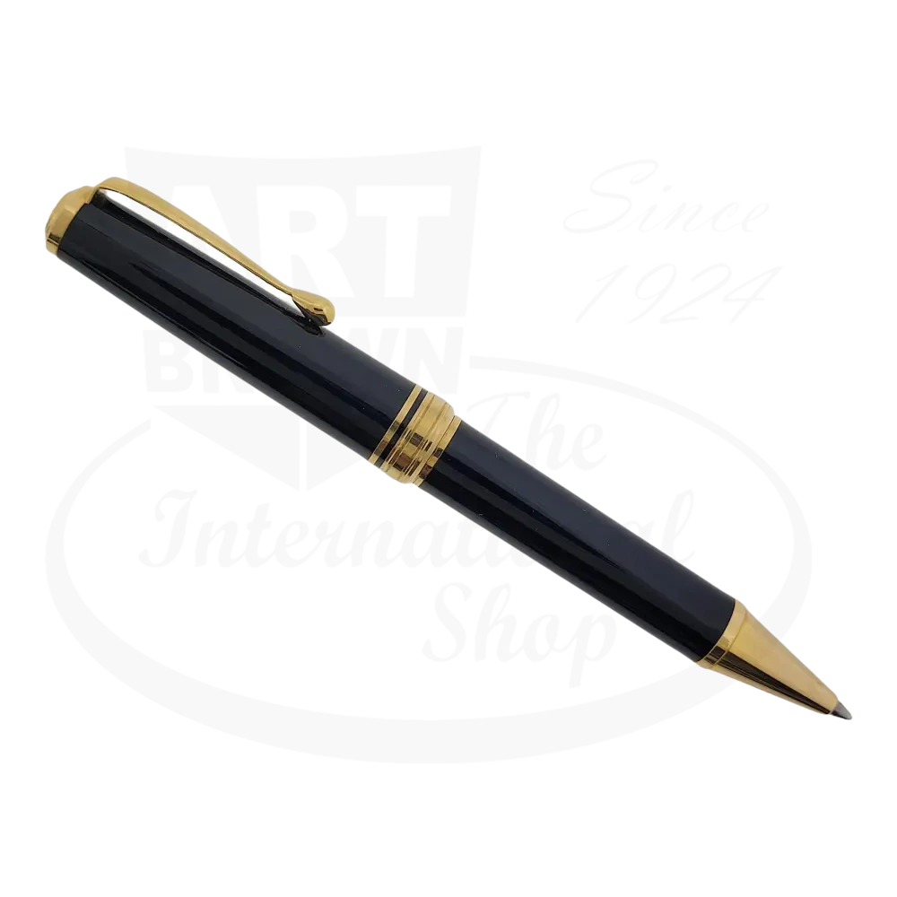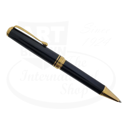 This is a refurbished pen set made with black resin and gold finish. Includes 1 ballpoint pen and 1 fountain pen with 14K nib. In great condition with visible marks.