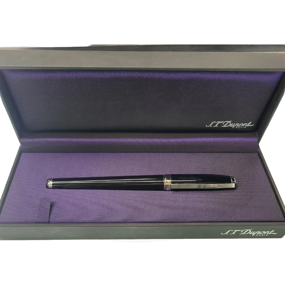 S.T. Dupont Fidelio fountain pen in black lacquer with palladium finish. This is a new old stock pen. Unused with very light marks. Comes with the original box, paperwork, and 2 year warranty. Pictures are of actual pen in stock.