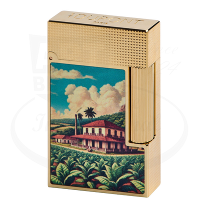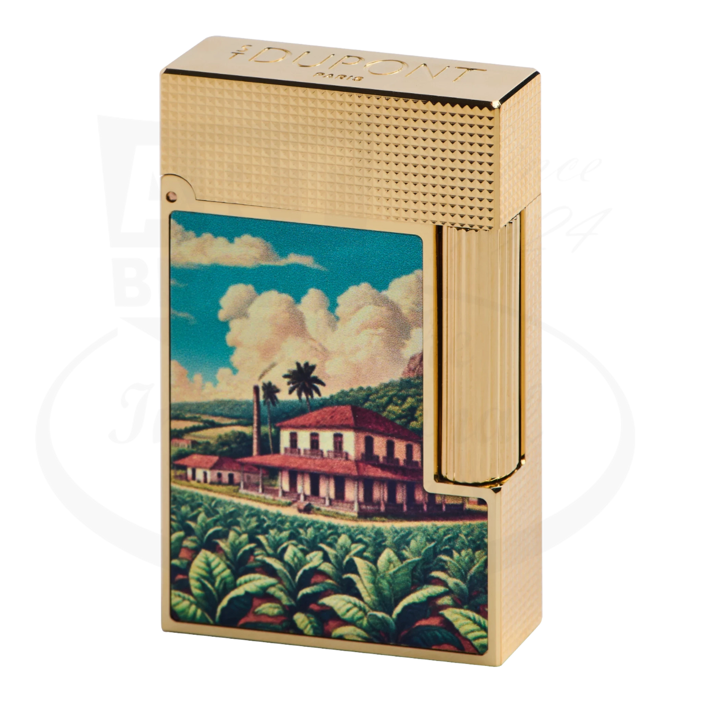 This U.S. exclusive S.T. Dupont Line 2 “Tobacco Estate” lighter pays tribute to Cuba’s legendary cigar-growing regions. Finished in yellow gold with the brand’s iconic micro-diamond head pattern, it features vivid lacquer imagery of a rural Cuban plantation surrounded by tobacco fields. Designed to honor the roots of cigar culture, this lighter is both a functional tool and a visual homage.
