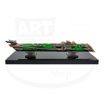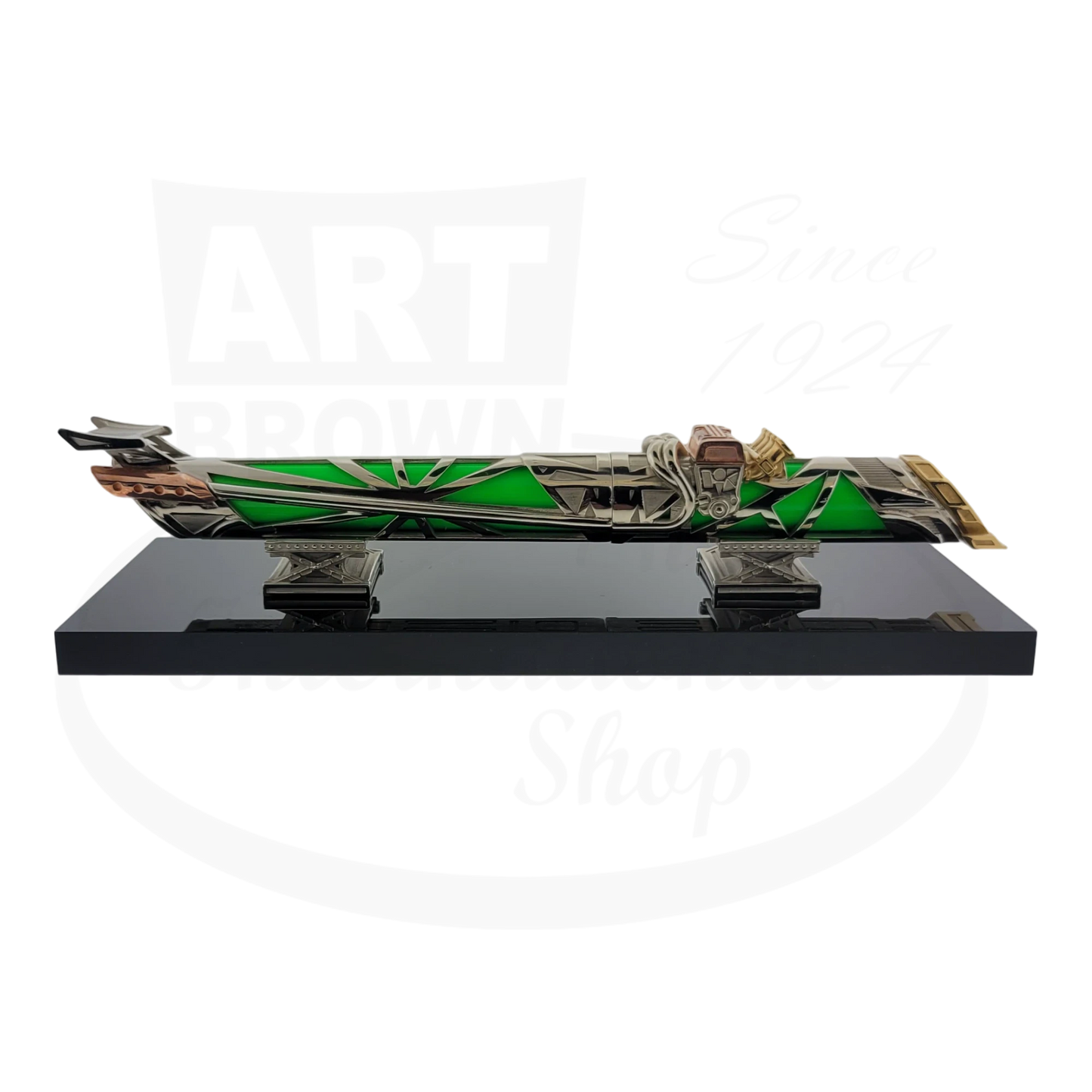 The pen features a striking green lacquer body adorned with intricate details inspired by the 4 Inline engine design. Crafted with a meticulous combination of yellow bronze with nickel finishing, and gold accents, this pen exudes luxury and precision. A standout feature is the inclusion of a 1mm diamond, adding a touch of brilliance and sophistication.