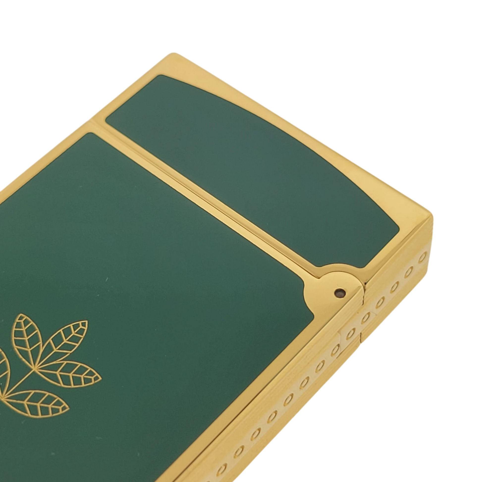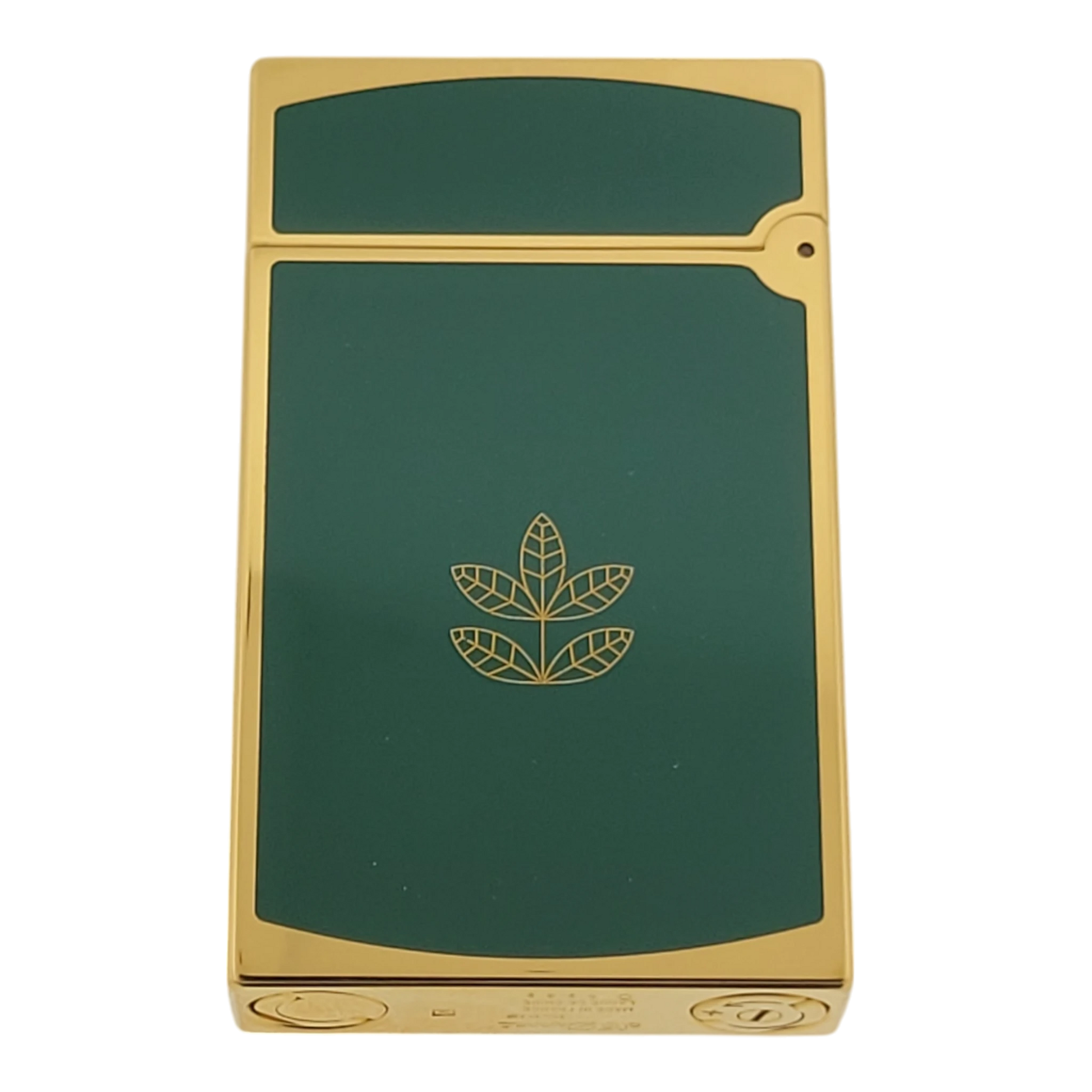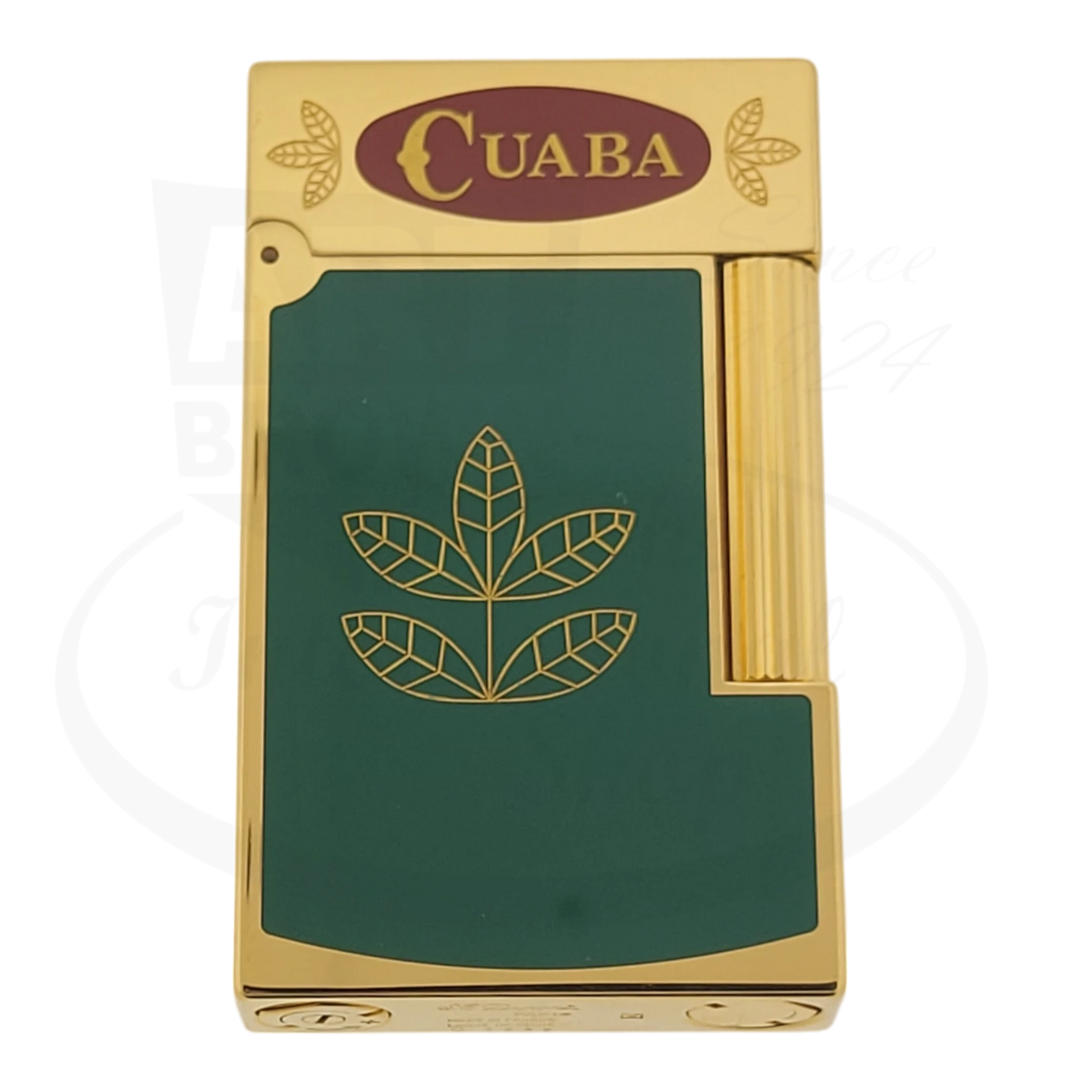 The Cuaba edition of the S.T. Dupont Habanos Collection pays homage to the uniquely shaped cigars known for their artisanal craftsmanship. Finished in a deep green Chinese lacquer with gilded accents and a stylized tobacco leaf motif, this lighter evokes the natural richness of the Cuaba brand. Designed for cigar collectors and fans of rare vitolas alike, this model blends elegance with cultural significance.