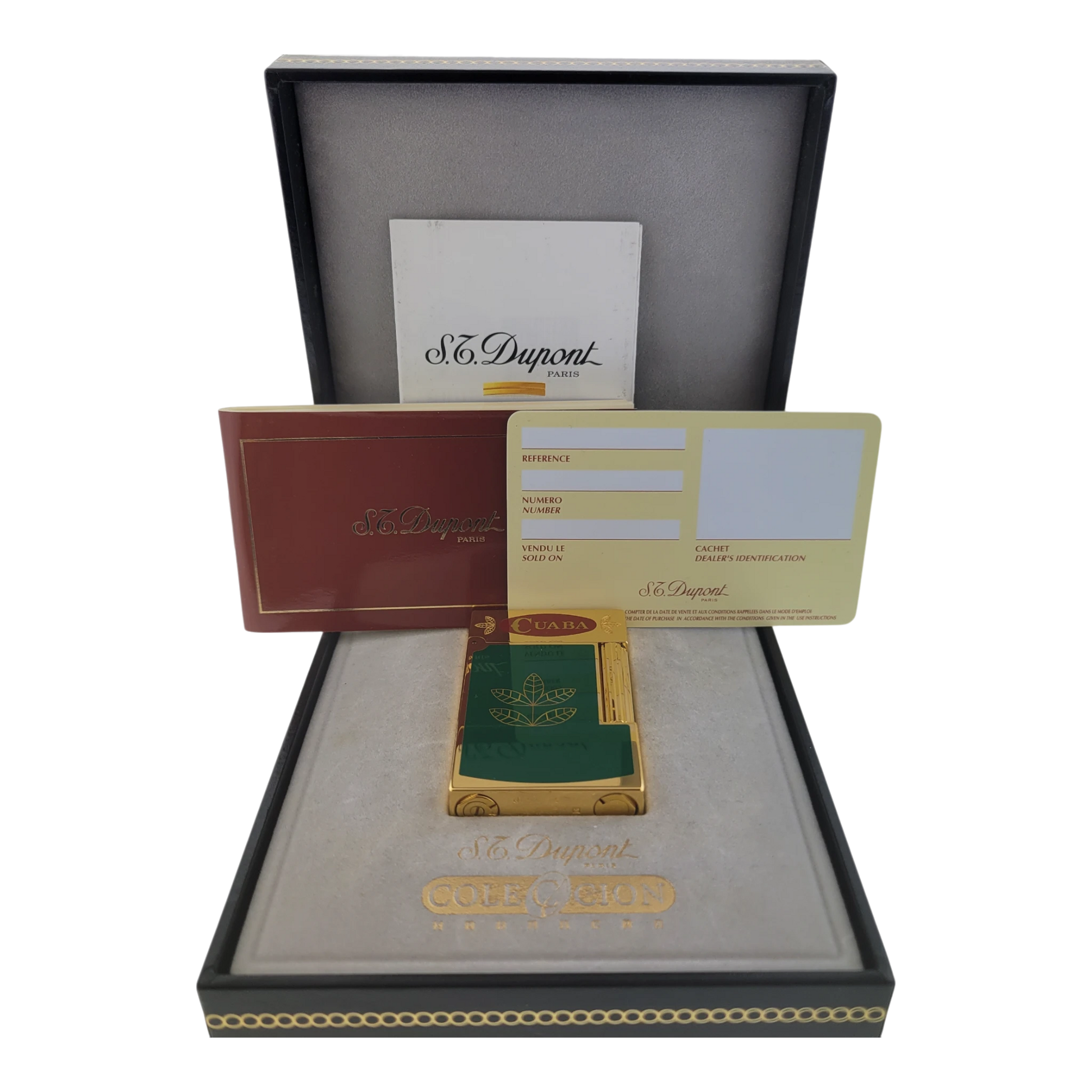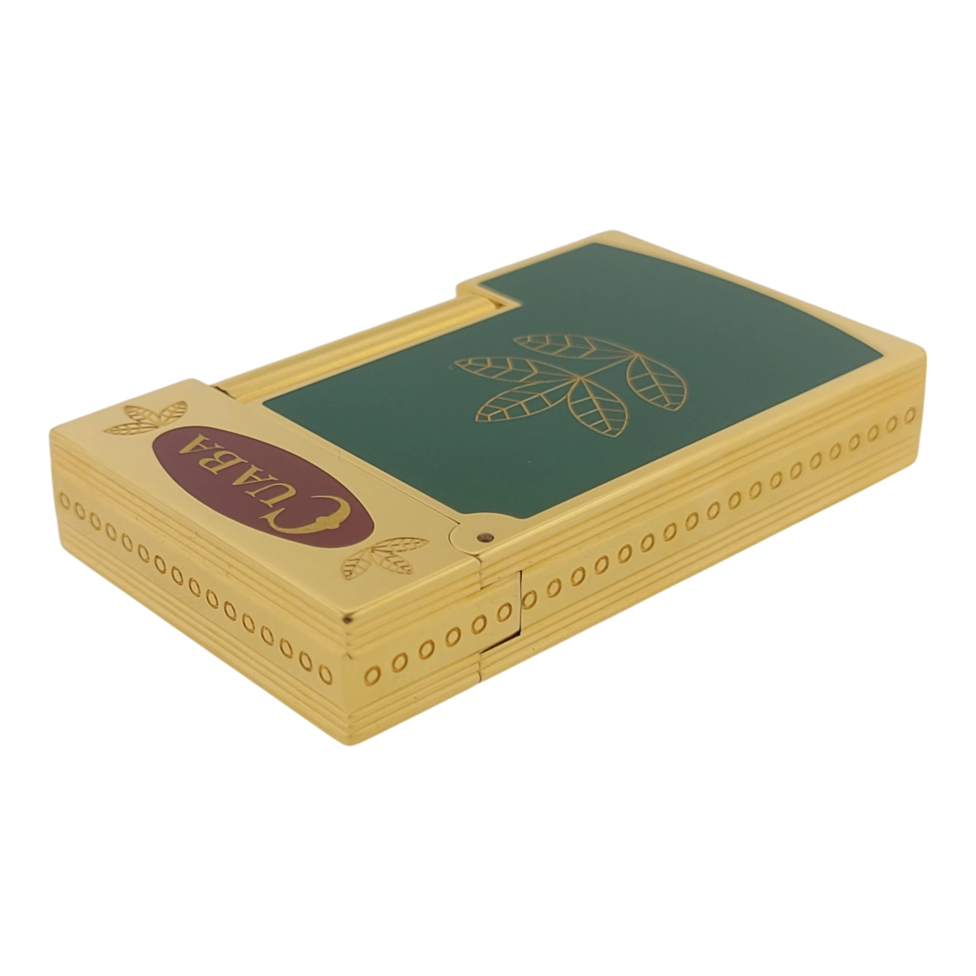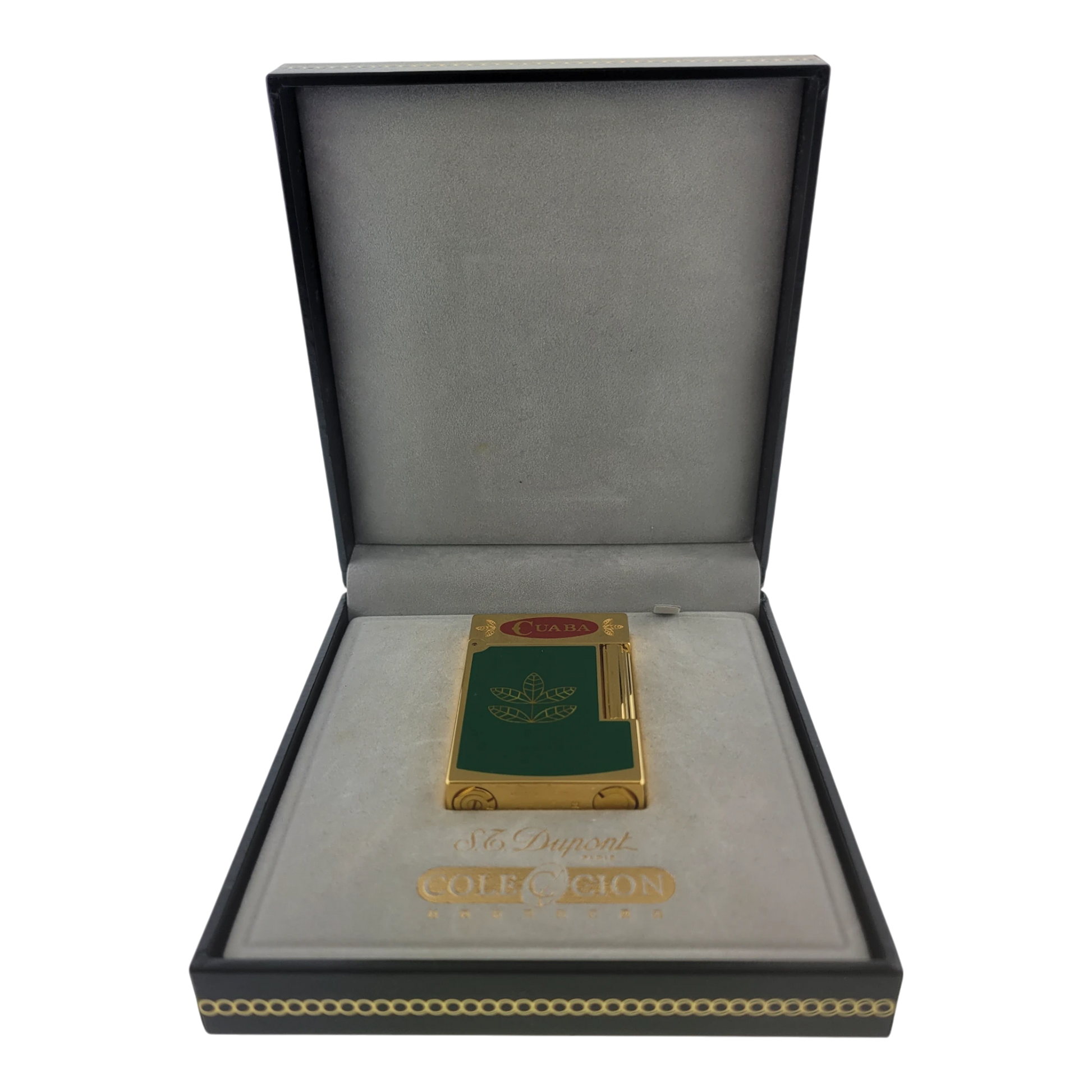The Cuaba edition of the S.T. Dupont Habanos Collection pays homage to the uniquely shaped cigars known for their artisanal craftsmanship. Finished in a deep green Chinese lacquer with gilded accents and a stylized tobacco leaf motif, this lighter evokes the natural richness of the Cuaba brand. Designed for cigar collectors and fans of rare vitolas alike, this model blends elegance with cultural significance.