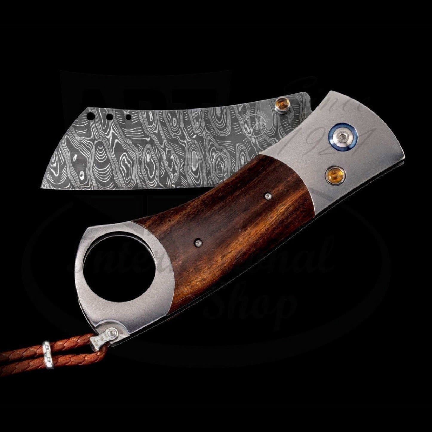 The Havana pays homage to the birthplace of fine cigars, and is without equal in the world of exotic cigar cutters. The thru hole in the titanium frame will accommodate up to a 52 gauge cigar, and the single sided precision ground damascus blade cuts cleanly thru your preferred smoke. The damascus is our stainless 'Hornets Nest' pattern by Mike Norris featuring three alloys forged together into a tapestry in steel with an optimum hardness of HRC 59 for wear resistance. Inlayed Arizona Ironwood is hand-polished to fine luster, and citrine gemstones, titanium, stainless, and sterling hardware complete the presentation. This piece works beautifully as a cigar cutter and general purpose pocket knife!