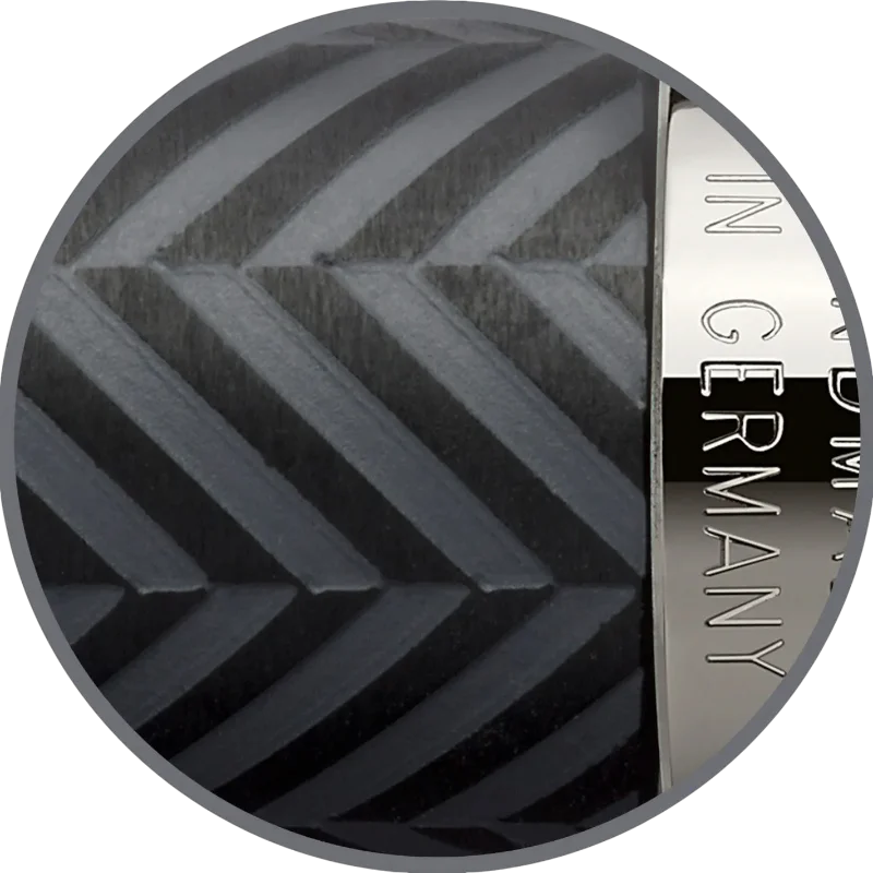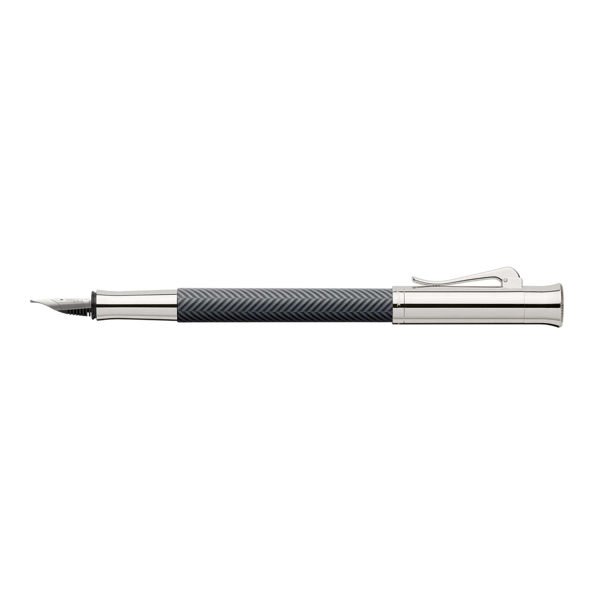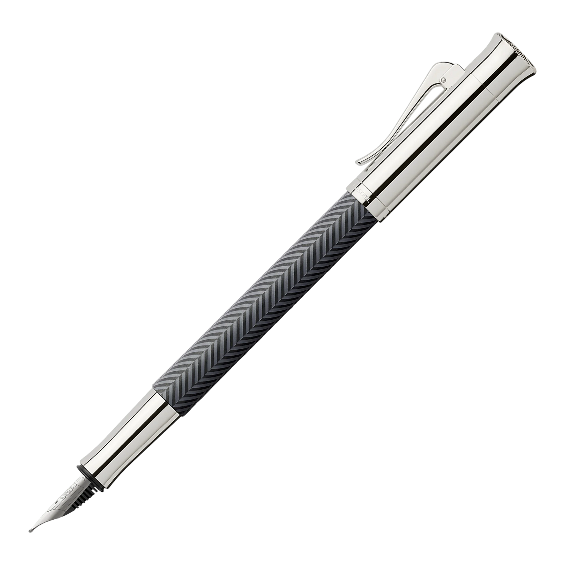 The Graf von Faber-Castell Guilloche Anthracite Fountain Pen features a matte precious resin barrel engraved with a herringbone guilloché pattern—a traditional decorative technique of fine intersecting lines once used for jewelry and luxury timepieces. The deep anthracite tone and textured finish give this model a more understated, architectural character. Rhodium-plated metal fittings and a solid, spring-loaded clip complement the cool palette.