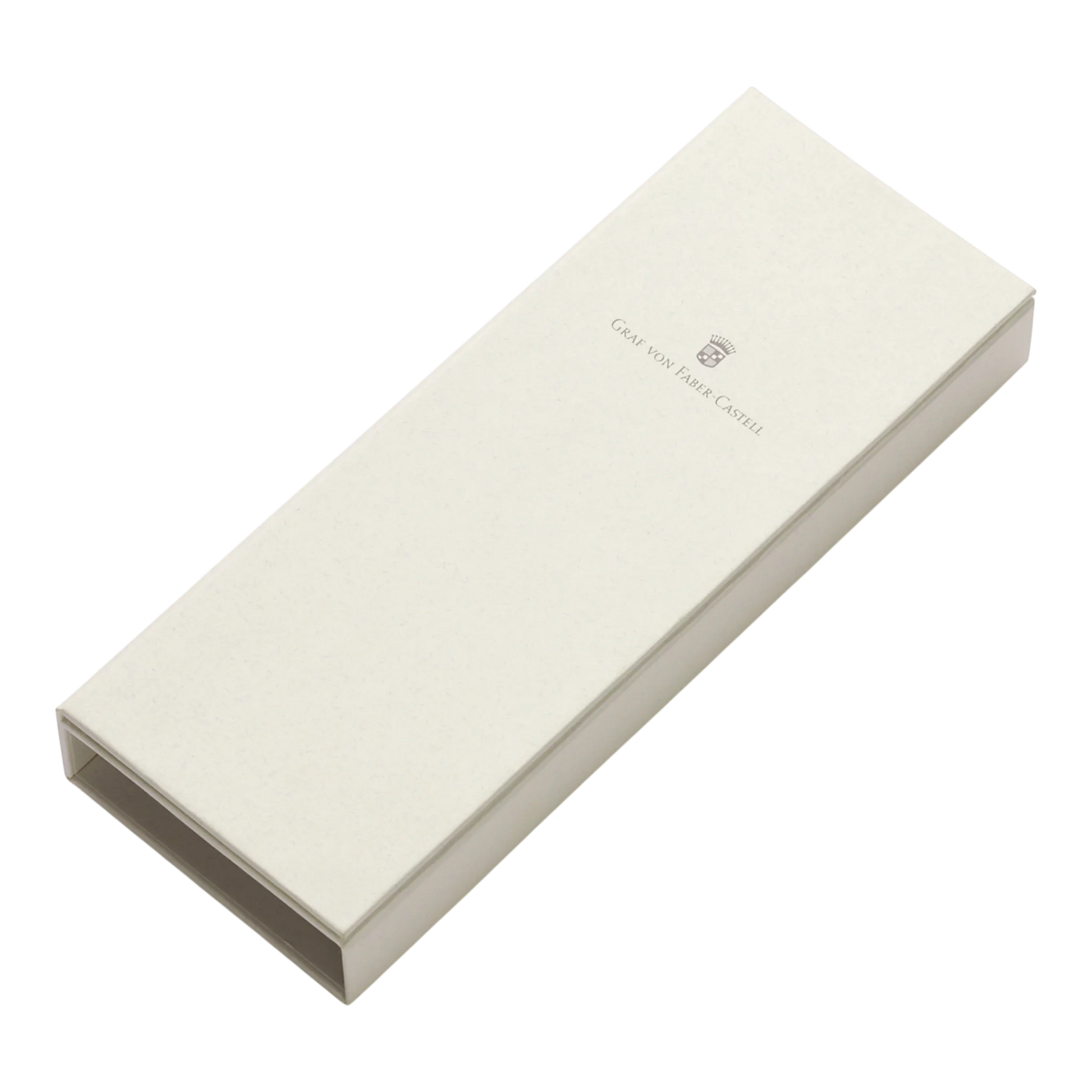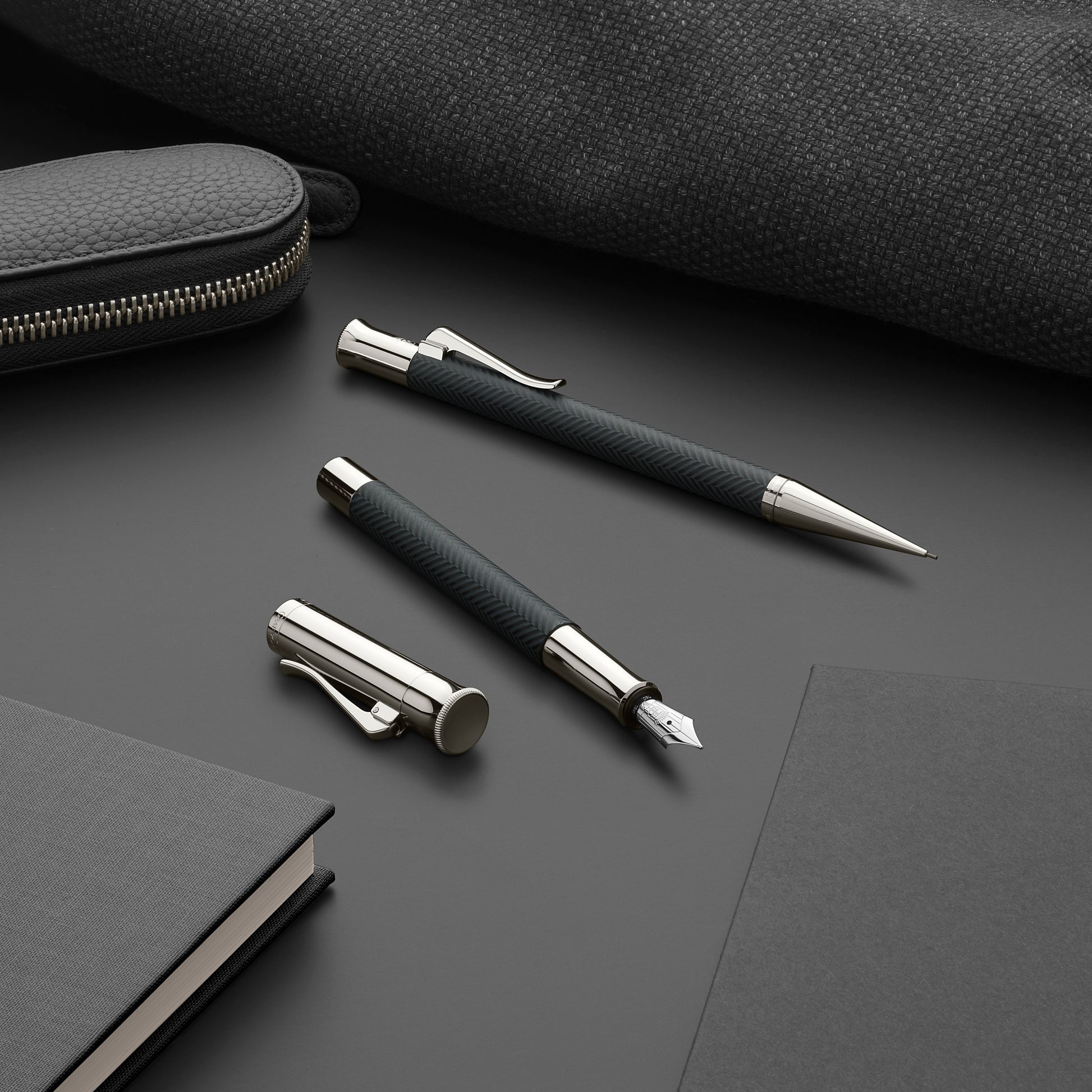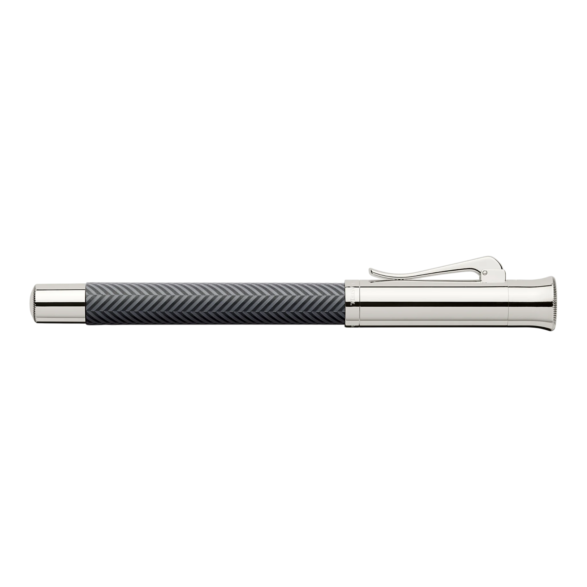 The Graf von Faber-Castell Guilloche Anthracite Fountain Pen features a matte precious resin barrel engraved with a herringbone guilloché pattern—a traditional decorative technique of fine intersecting lines once used for jewelry and luxury timepieces. The deep anthracite tone and textured finish give this model a more understated, architectural character. Rhodium-plated metal fittings and a solid, spring-loaded clip complement the cool palette.